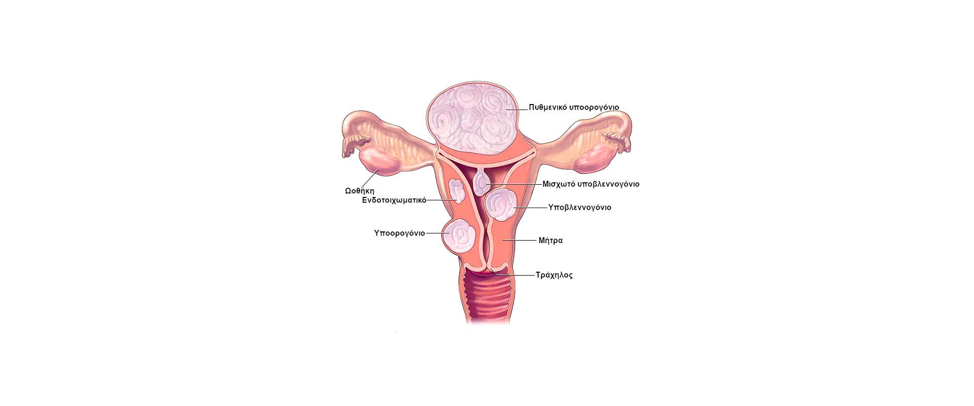 ⦁ Υποορογόνια: Αναπτύσσονται προς τον ορογόνο, την εξωτερική δηλαδή επιφάνεια της μήτρας. Συνήθως δεν προκαλούν προβλήματα, εκτός και αν αποκτήσουν μεγάλο μέγεθος, πιέζοντας παρακείμενα όργανα.